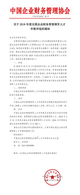 中财协[2018]50号关于2018年全国财务管理领军人才选拔的通知