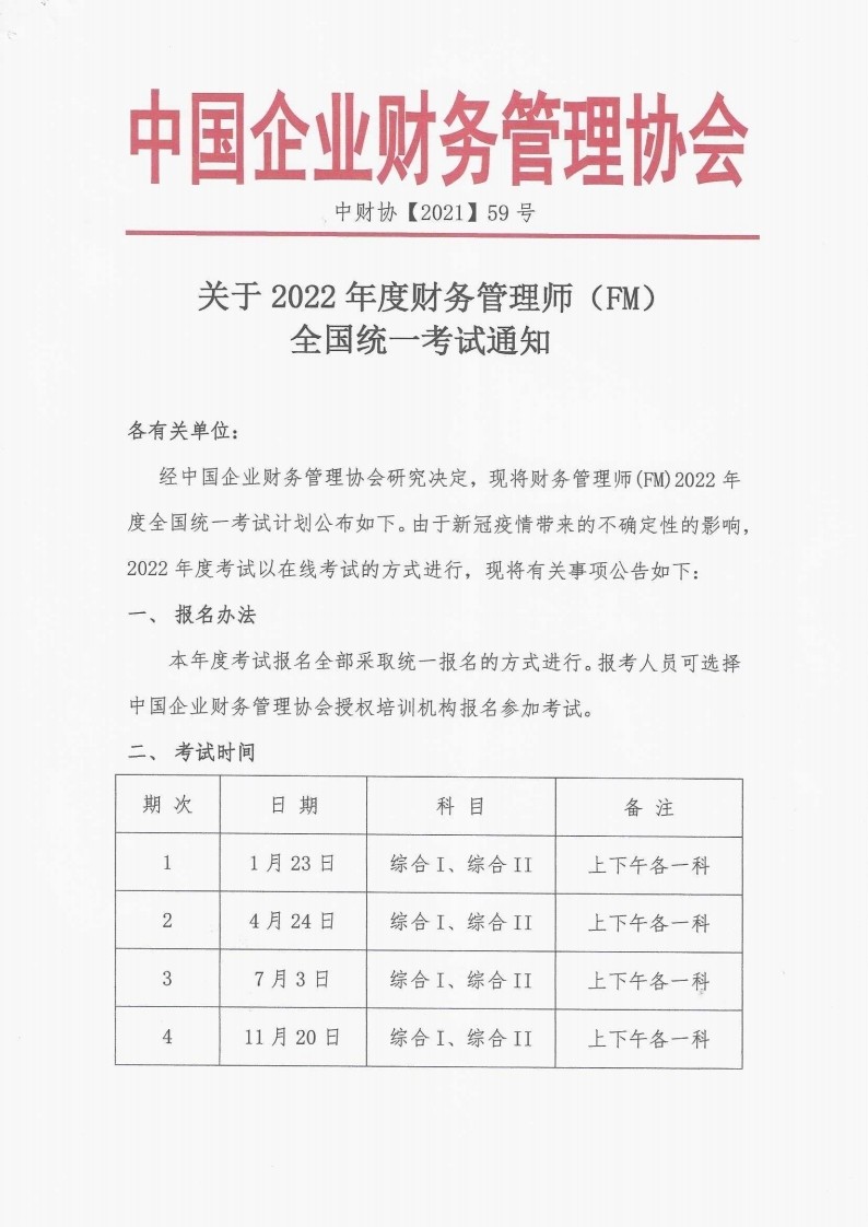 经中国企业财务管理协会研究决定,现将2022年财务管理师考试安排公布如下,请各合作机构相互转告。
